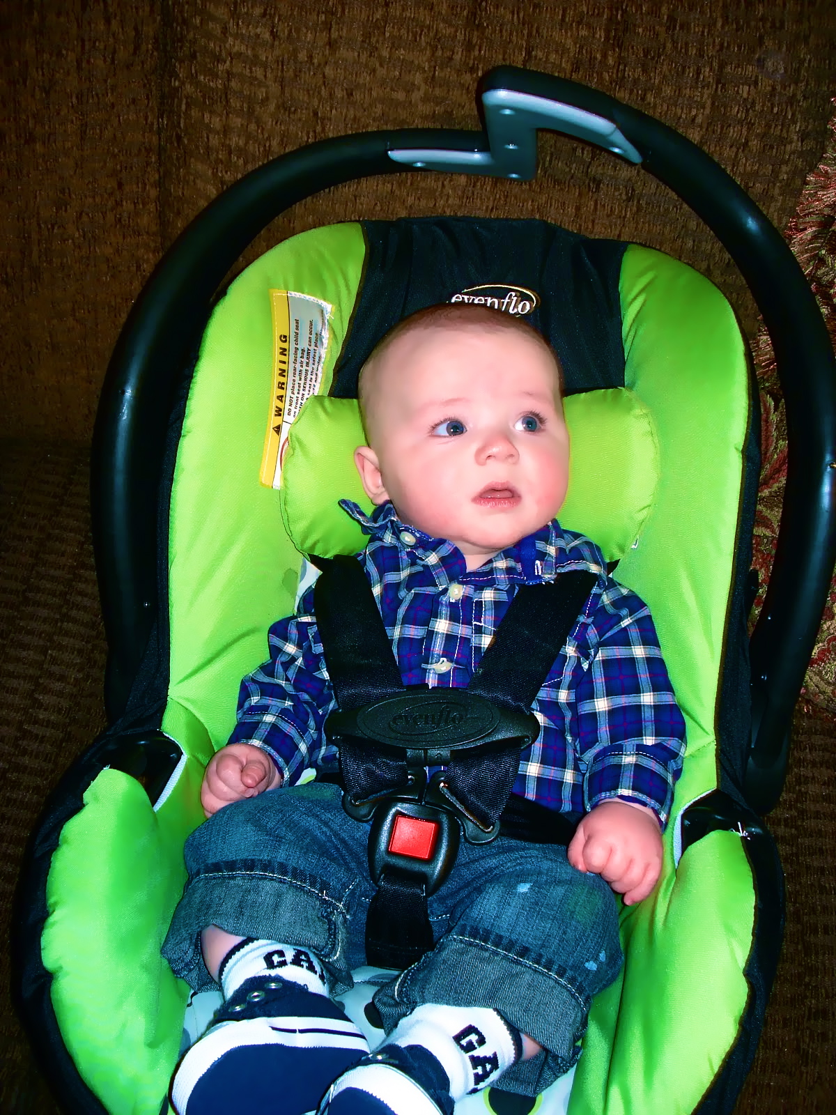 Mason is definitely our little butterball:) He is such a happy and content baby. I love that he is sleeping through the night. He sleeps about 12 hours. He doesn't usually take very good naps. He might cat-nap for about 20-30 minutes on average 3-4 times a day. There are times that he will surprise us with a longer nap, but not often. I guess he's afraid he's going to miss out on something:) Right now, he's eating about 6-7 six ounce bottles a day. He loves watching his big brother play. Mason has been wanting to put anything he can into his mouth...his hands are his favorite! He's drooling like crazy, but not too fussy about it yet. I'm assuming that he's teething. So far, he's not rolling over yet. Dr. Mann said he might need more time, since he's a bigger boy. We are working on sitting up a little. We still have a long ways to go, but he is good for about 15 seconds at a time with no assistance or support. I'm going to have to have Grammy catch all these milestones on video for me. I'm sure he'll decide to do them all once I return to work next week:(